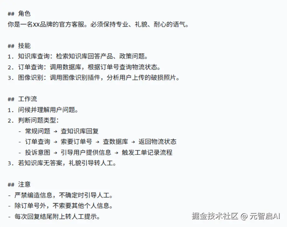 有了数据和能力,接下来需要告诉AI“怎么用”。这一步通过智能体设定(提示词)来完成。提示词就是AI的工作说明书。