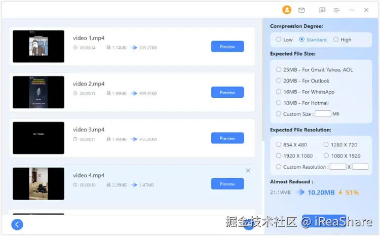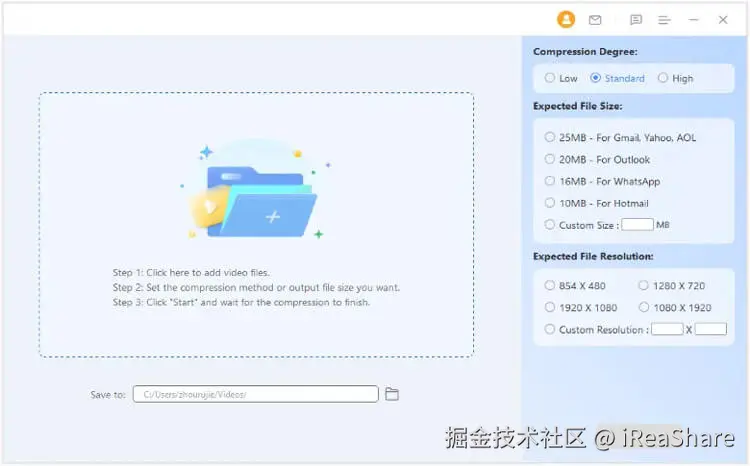 虽然所有压缩都会造成一定的数据损失,但使用 iReaShare 上的视频压缩器可以让您调整比特率。它的目标是在不显著降低画质的情况下快速减小文件大小。此外,它还允许您直接选择所需的文件大小。