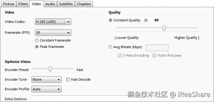 使用“恒定质量”滑块。将其向左移动(提高射频值)会增加压缩率。“射频值 20-23 ”通常是质量和文件大小的最佳平衡点。