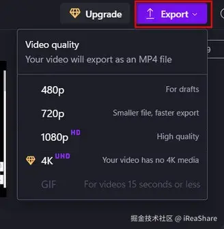 选择较低的分辨率(例如,720p 而不是 1080p 或 4K)。降低分辨率是立即减小文件大小最有效的方法之一。