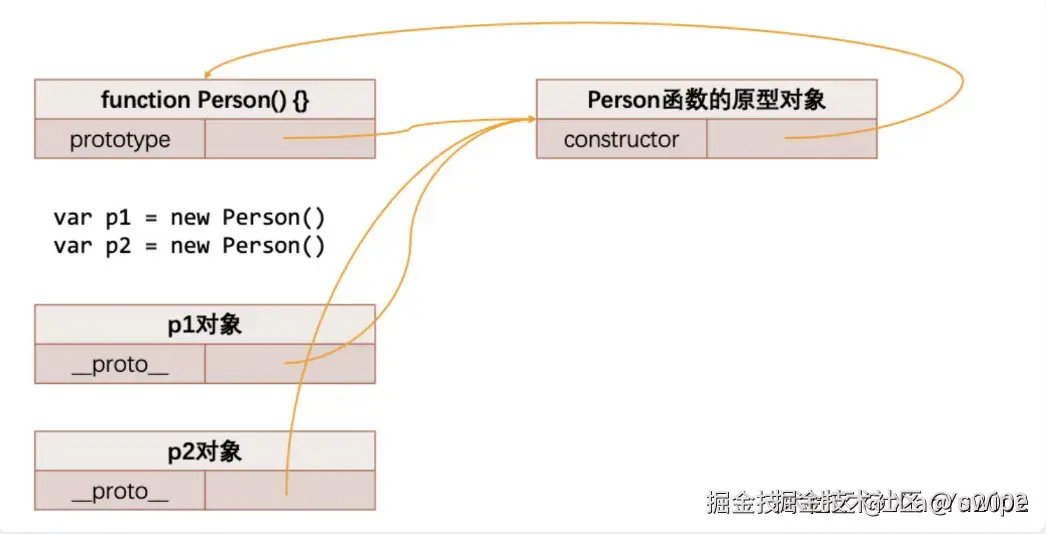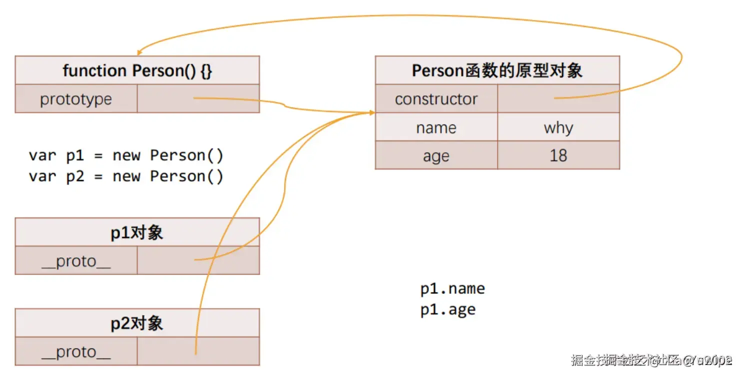 因为你不是把数据放进 p1、p2 自身,而是放进了它们共享的 Person.prototype。