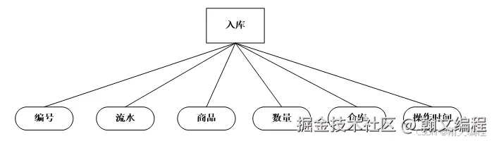 入库信息实体,主要包括 入库编号,流水,商品,数量,仓库,操作时间 等信息实体。如图4.7所示:
