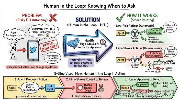 人类参与不是对每个动作微观管理,而在于识别高风险决策并路由给人工批准,同时让低风险行动自动执行。
