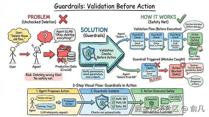 护栏是在任何行动执行前运行的验证检查。它们验证权限、检查参数是否合理,并扫描输出中的敏感数据。把它们看作在错误造成损害之前捕捉错误的安全网。