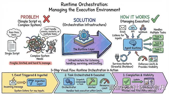 运行时编排是基础设施层,负责管理智能体如何监听不同来源的输入、处理优雅关闭、提供对当前行为的可见性,以及强制执行限制防止失控。