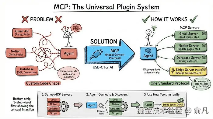 MCP(模型上下文协议)通过创建一种标准让智能体与任意工具交互,解决了这个问题。它就像 AI 领域的 USB 接口。你不需要为手机上的每个应用配备不同的接口。这里的理念是一样的。