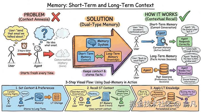 你的智能体和用户进行了一次对话。三小时后,用户说"发送我们刚才谈到的那封邮件",智能体完全不知道说的是哪封邮件,因为对话历史已经丢失了。