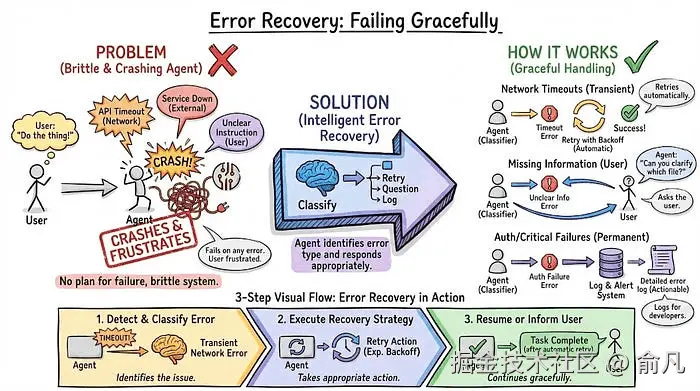 API 会超时,服务会宕机,用户会给出不清晰的指令。智能体一定会遇到错误,问题在于它会崩溃还是智能处理。
