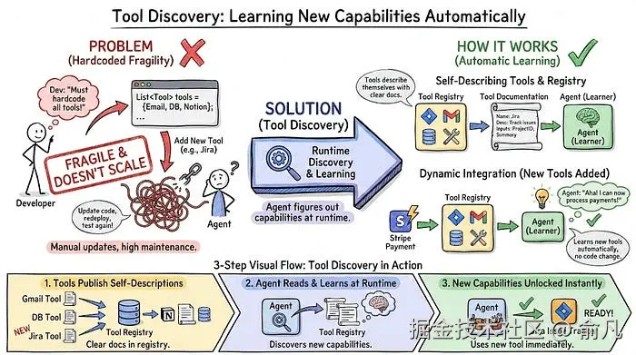 工具发现意味着智能体在运行时就能弄清楚它能做什么。工具通过清晰的文档描述自身,智能体读取这些描述,添加新工具后自动学习如何使用。