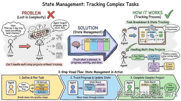 状态管理用于跟踪计划了什么、什么在进行中、什么在等待输入、什么已经完成的方式。没有它,智能体无法处理任何比单次查询更复杂的任务。