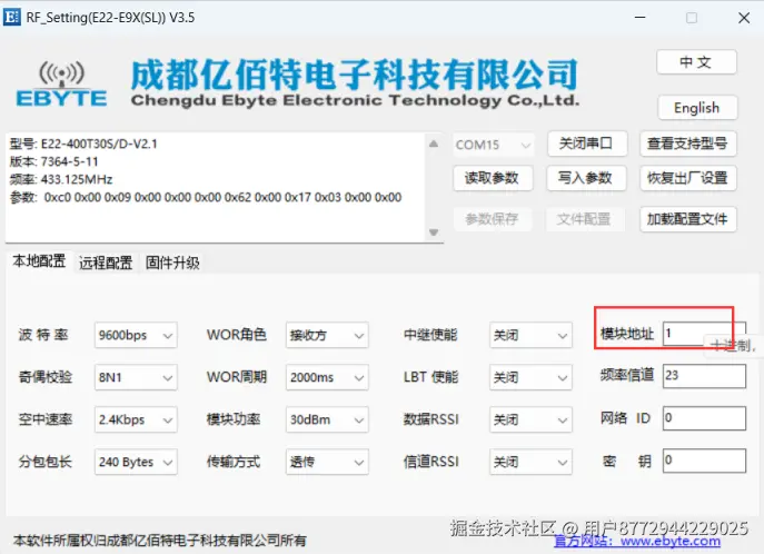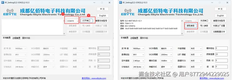 电脑打开RF_Setting(E22-E9X(SL)) 软件,选择对应的串口,打开串口,点击读取参数,即可读取到DTU的默认参数