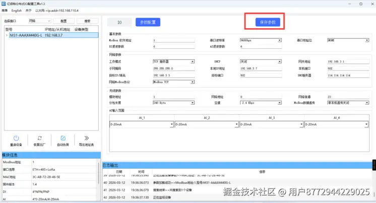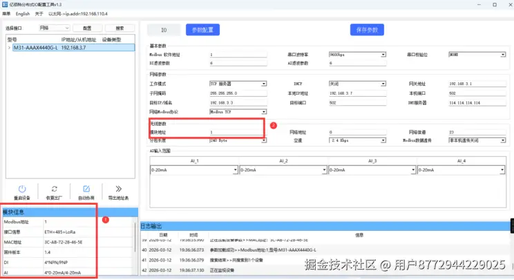点击搜索出的设备,可在此处查看无线分布式IO的modbus地址,记录LoRa无线分布式IO的modbus地址为1,,点击配置即可配置参数,将LoRa无线分布式IO中的无线参数->模块地址这一项修改为1,其他参数保持默认即可。