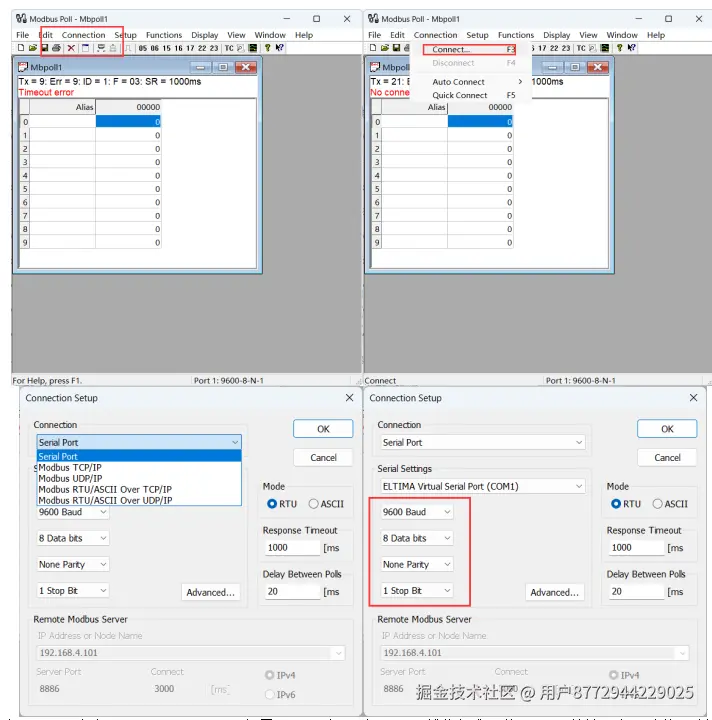 电脑打开modus poll软件,点击connection,选择serial port,选择E90电台对应串口,注意波特率9600 8N1。