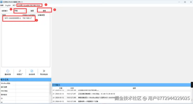 打开分布式IO配置上位机软件,点击左上角选择以太网网卡为刚刚修改的以太网IP地址并切换接口为网络(LoRa无线分布式IO支持以太网、485双接口通讯和配置参数,本次教程使用以太网,若用户需要使用串口进行配置,请选择接口为串口并使用USB转485,按照A接A,B接B的方式连接),点击搜索即可搜索到设备。