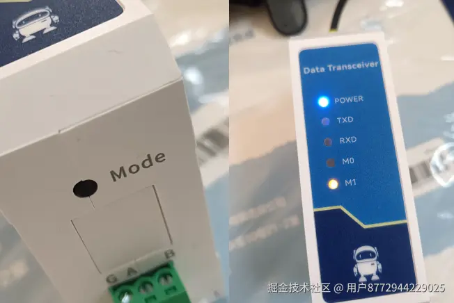 若使用E95/E96电台,需使用mode按键,将电台切换为配置模式,M0 M1指示灯按到如图M0 熄灭 M1亮起即表示电台进入配置模式。