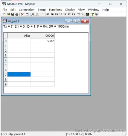 可以看到modbus poll 读取到了LoRa无线分布式IO采集的AI1数据。