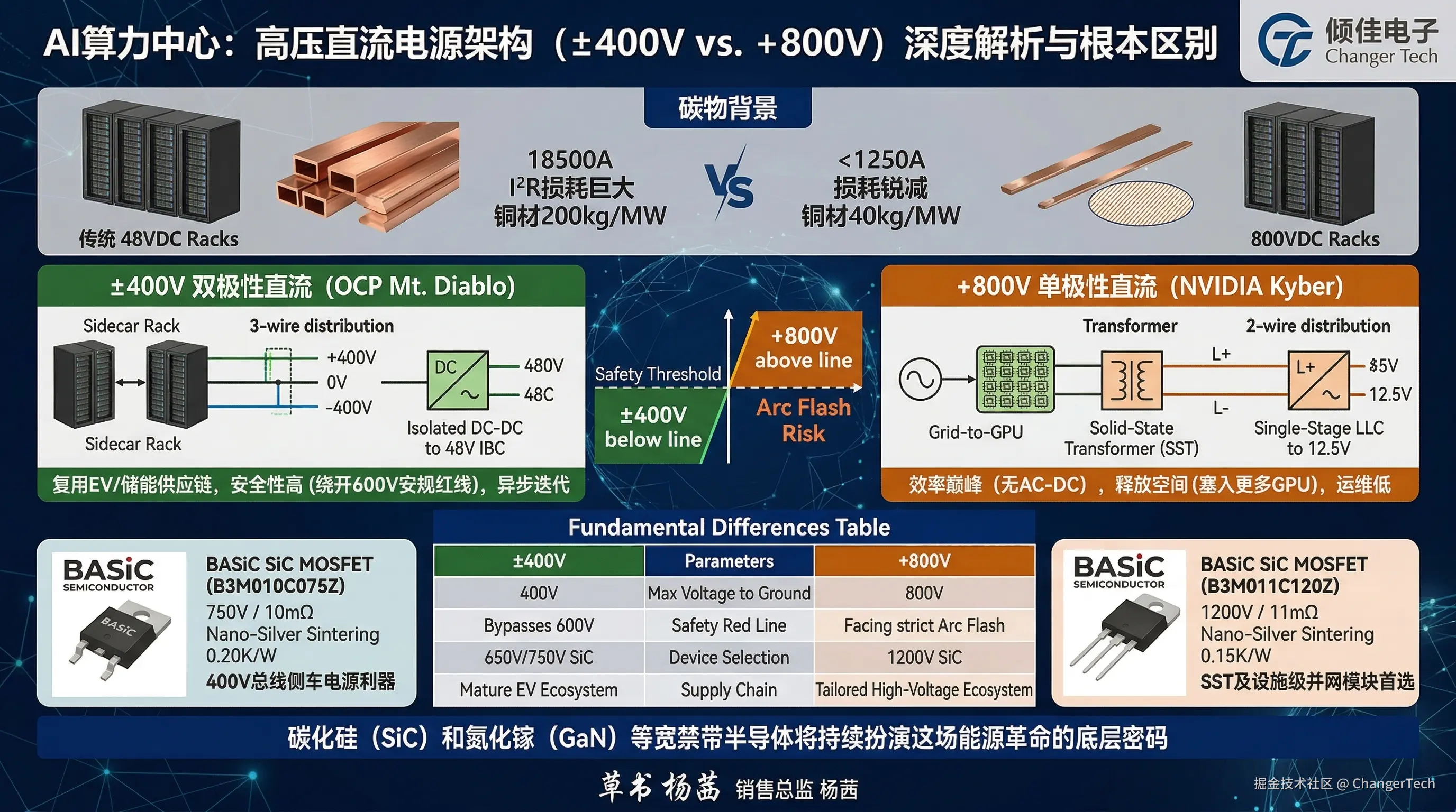 在这一宏观背景下,提升机架配电电压至高压直流(HVDC)成为解决“性能-密度陷阱”的唯一物理途径 。目前,业界在向兆瓦级机架演进的过程中,形成了两条具有根本差异的技术路线:一是以开放计算项目(OCP)Mt. Diablo项目为代表的±400V双极性直流架构,二是以NVIDIA Kyber机架为核心的+800V单极性直流架构 。这两种架构的实现,不仅需要对供电网络进行彻底的重构,更深度依赖于碳化硅(SiC)等宽禁带半导体在功率转换环节的技术跃迁。本报告将深入剖析这两种高压直流架构的核心差异,探讨其在安全性、拓扑结构及效率层面的系统级影响,并基于具体的SiC MOSFET器件参数,全面评估其在未来AI数据中心中的应用适用性。