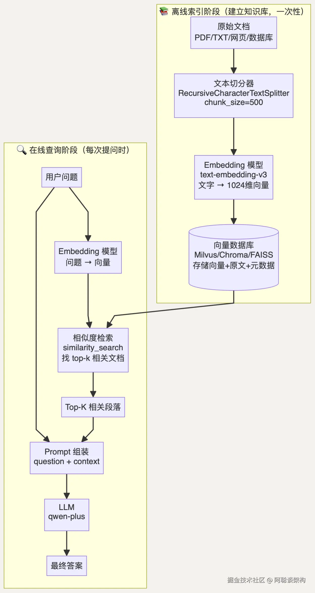 关键洞察:索引阶段只运行一次(或定期更新),查询阶段每次提问都运行。系统的响应速度主要取决于查询阶段,而查询阶段的向量检索通常只需要几毫秒。
