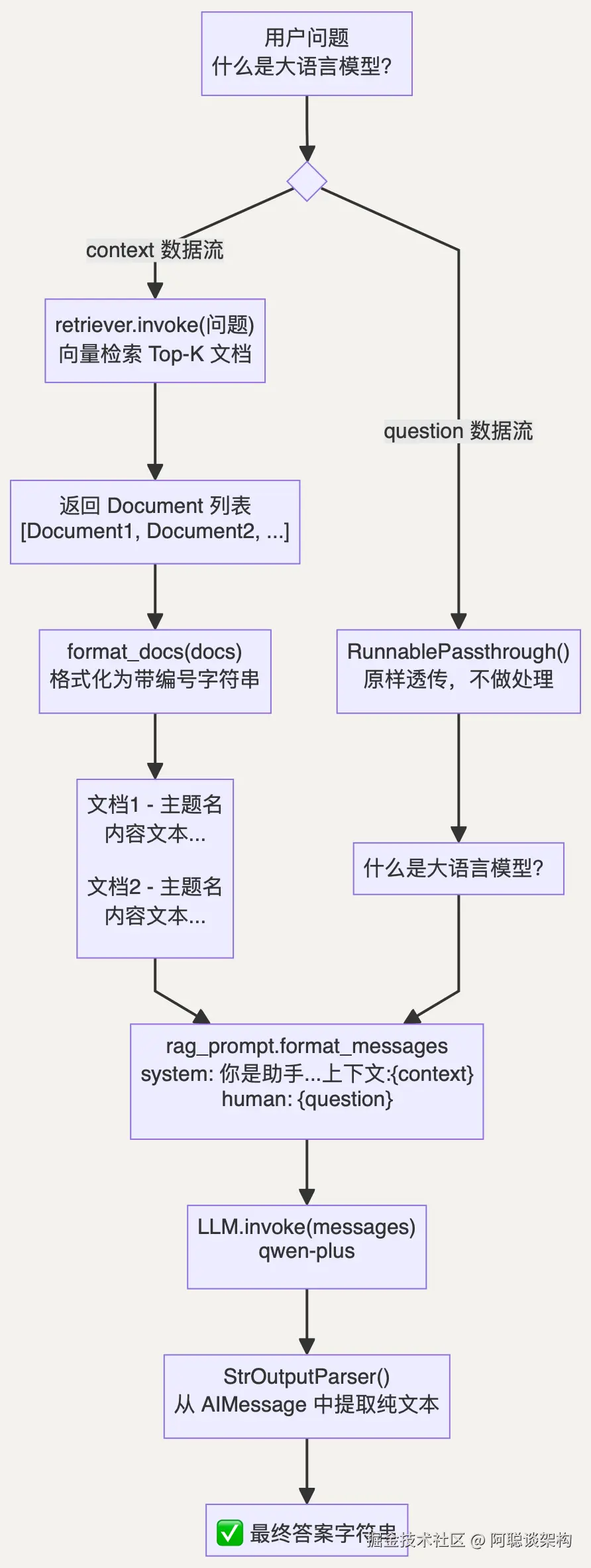 最后一步,拿到检索到的文档块 + 用户问题,生成最终答案。本项目使用 qwen-plus: