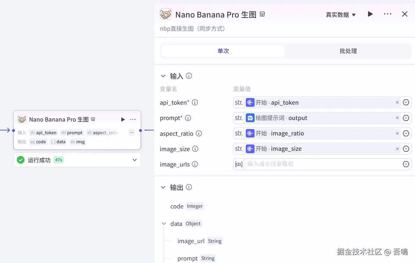 这个节点使用到了扣子三方的插件,插件名字叫做【AI绘图工具箱】,需要的工具是【gen_nbp_image_sync】。