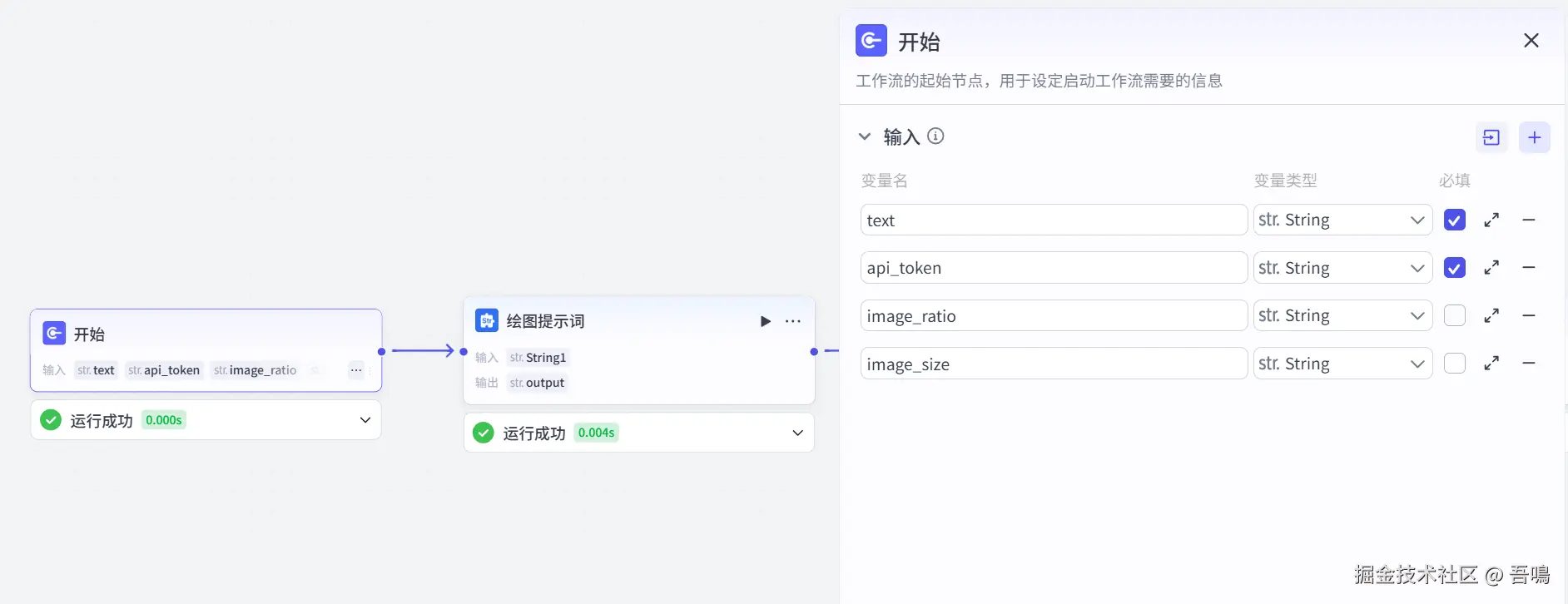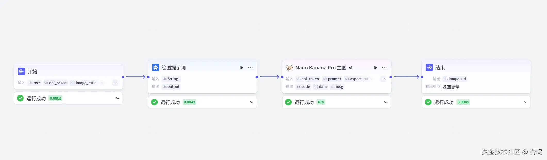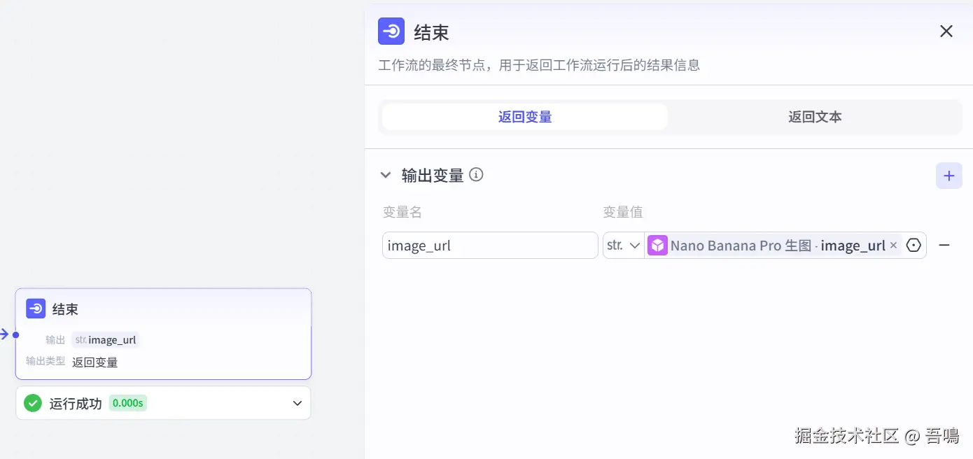 结束节点只有一个image_url的参数,这个参数的含义就是生成好的手绘黑板报图片的访问链接,如果输入有值的话,说明图片生成成功了,没有值,那么就说明失败了。
