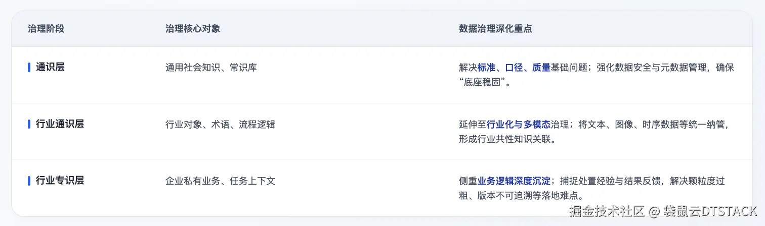 当数据集建设走向行业通识层,治理重点也会同步变化。企业需要围绕行业对象、术语体系、流程逻辑和知识关系来组织数据,并将文本、图像、音视频、日志、时序等多种类型的数据纳入统一治理范围。此时,数据治理已经从基础治理延伸到行业治理和多模态治理,支撑行业大模型和行业知识库建设。