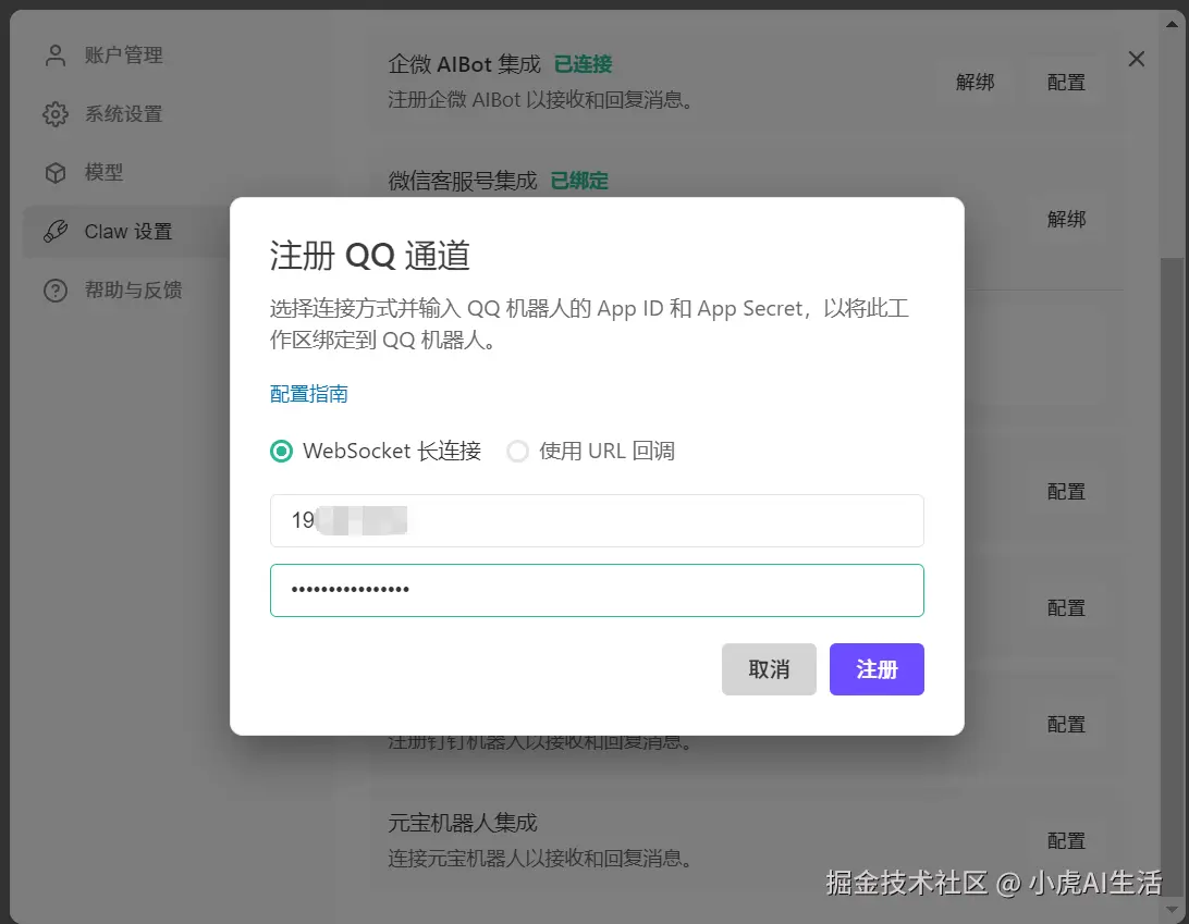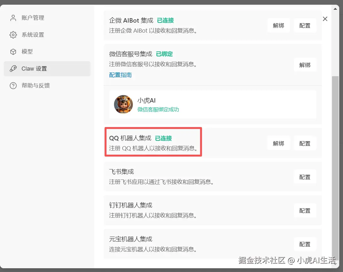- 左下角头像 → Claw 设置 → 集成(BETA)→「QQ 机器人集成」→「配置」