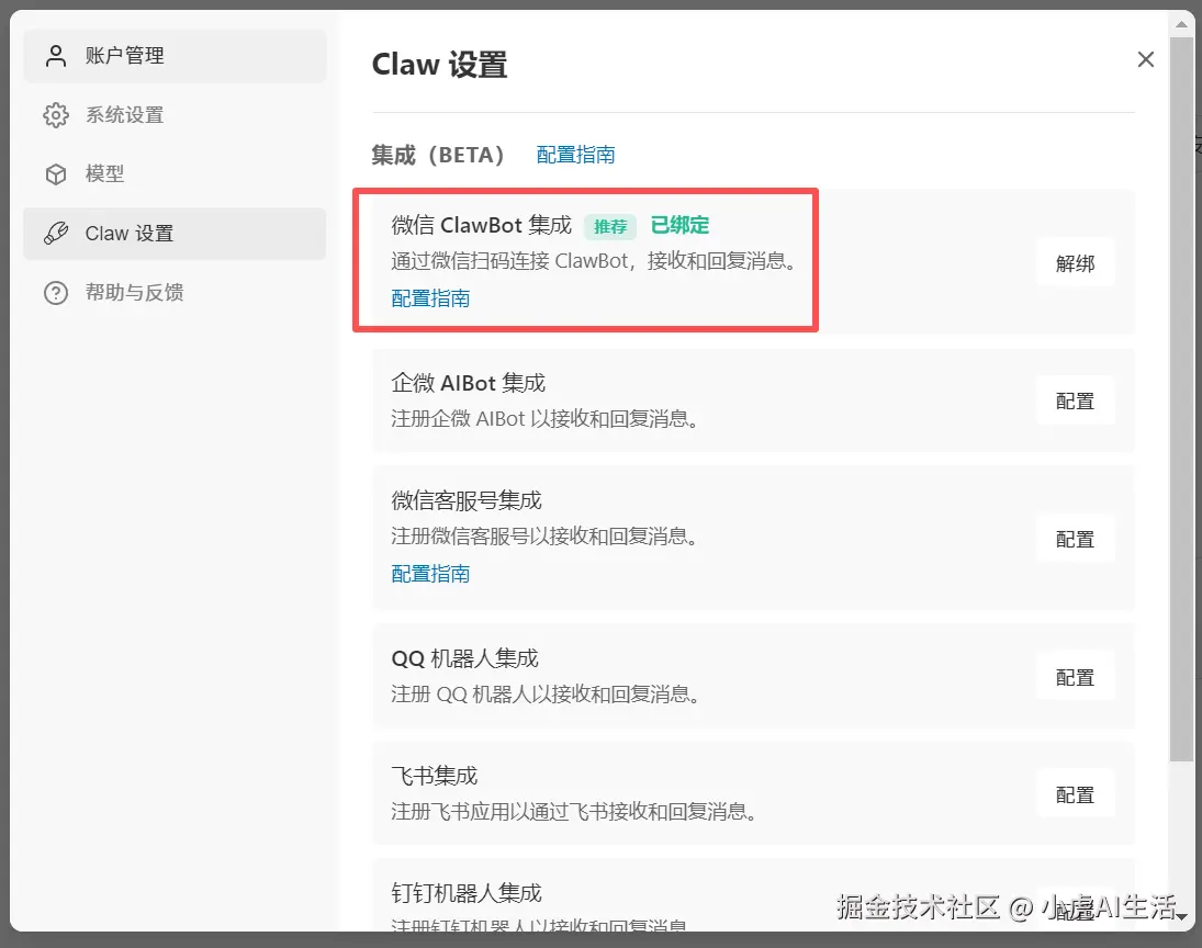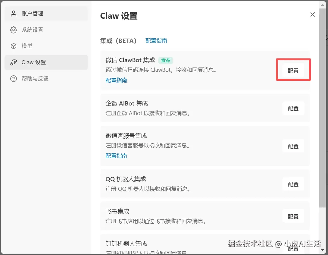 - 左下角头像 → Claw 设置 → 集成(BETA)→「微信 ClawBot 集成」→「配置」
