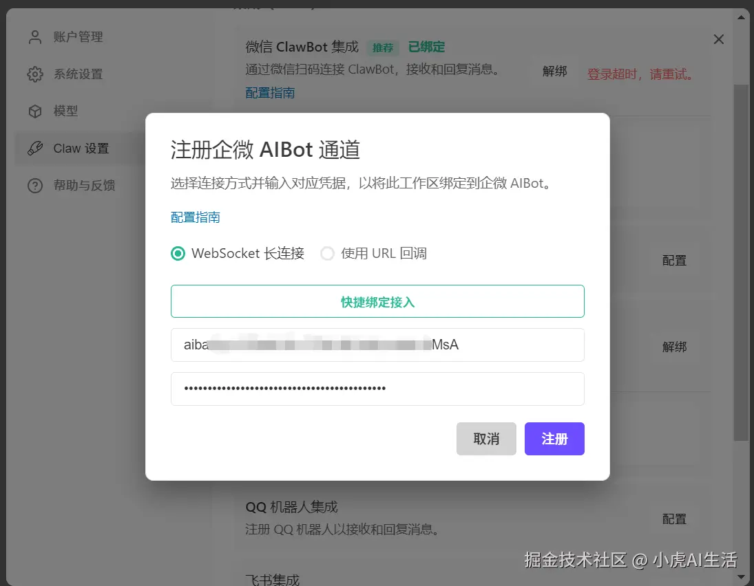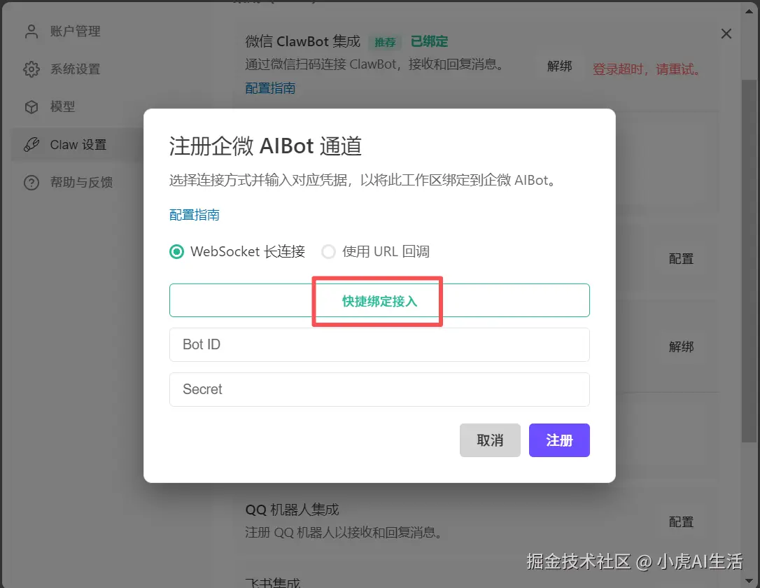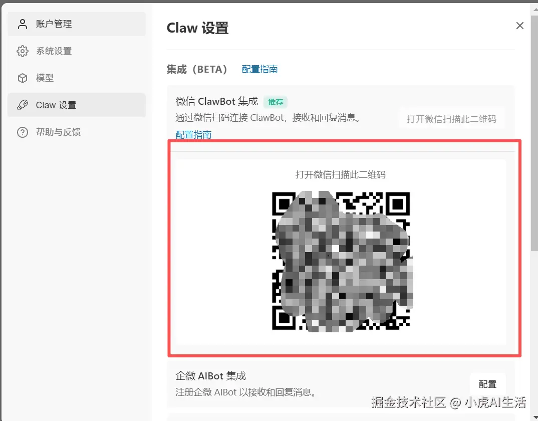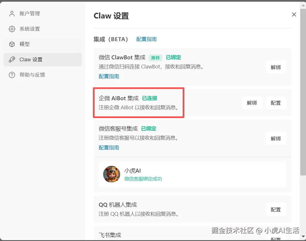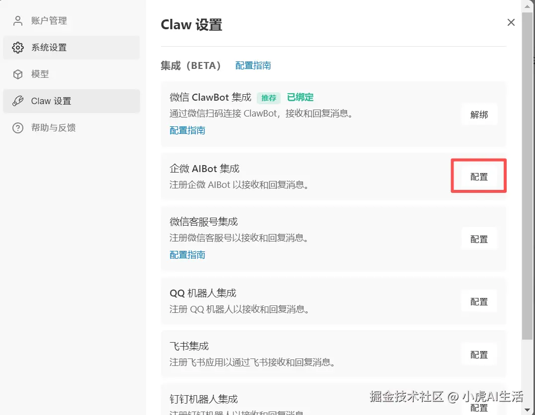 - 左下角头像 → Claw 设置 → 集成(BETA)→「企微 AIBot 集成」→「配置」