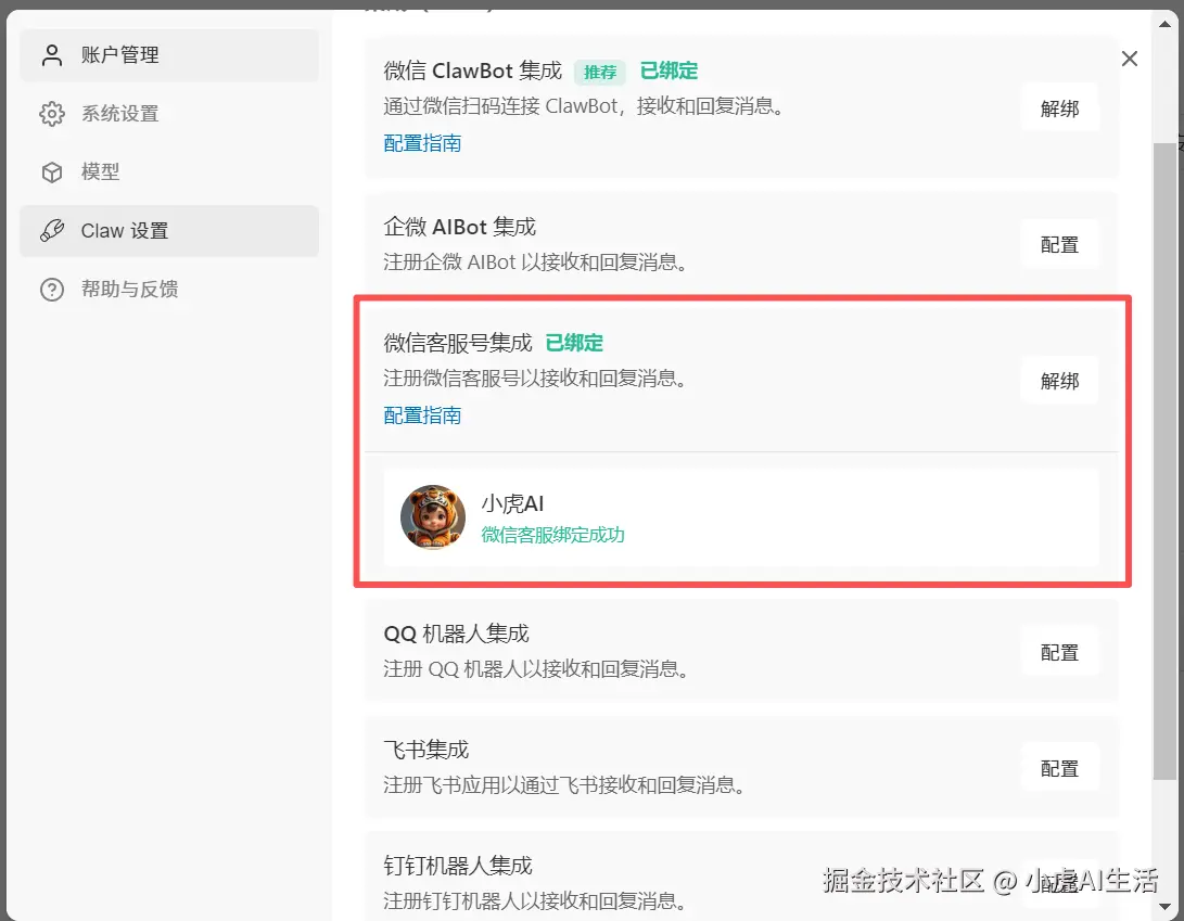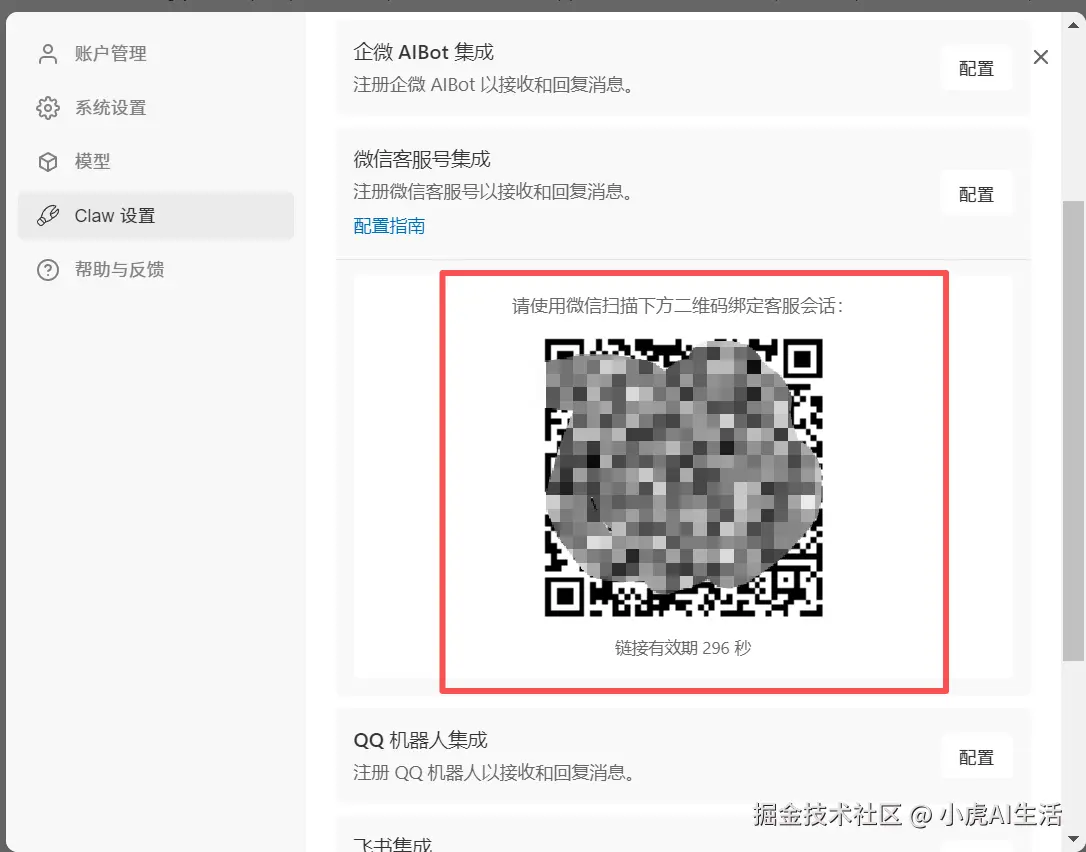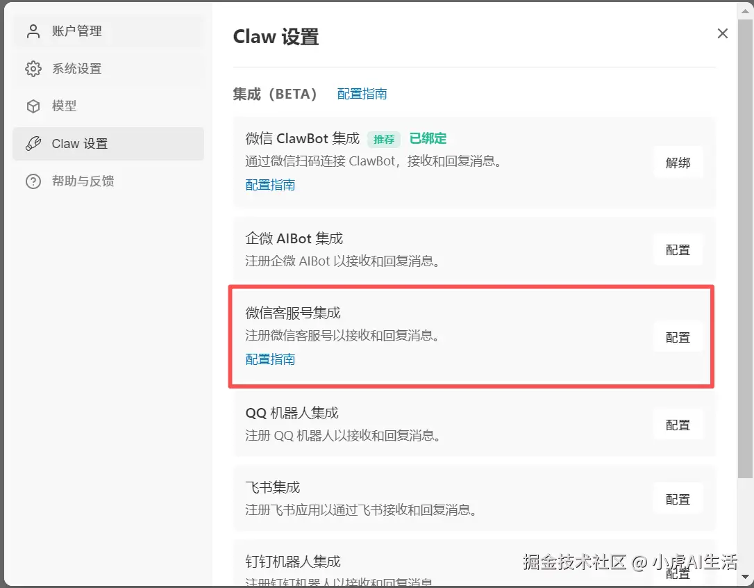 - 左下角头像 → Claw 设置 → 集成(BETA)→「微信客服号集成」→「配置」