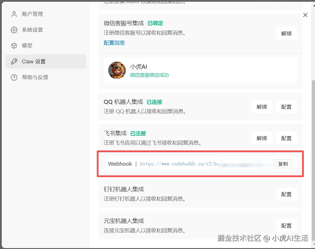 左下角头像 → Claw 设置 → 集成(BETA)→「飞书集成」→「配置」→ 填入 App ID + App Secret → 同时把这里生成的 Webhook 地址复制出来,回到上一步填进飞书"请求地址"里 → 保存