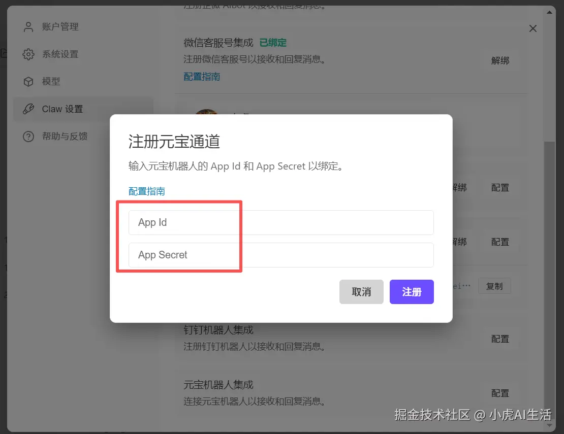 左下角头像 → Claw 设置 → 集成(BETA)→「元宝机器人集成」→「配置」→ 填入 App Key + App Secret → 保存,状态显示「已绑定」✅