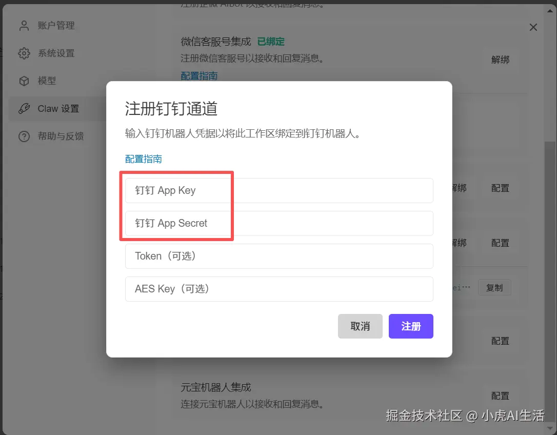 左下角头像 → Claw 设置 → 集成(BETA)→「钉钉机器人集成」→「配置」→ 填入 App Key + App Secret → 保存