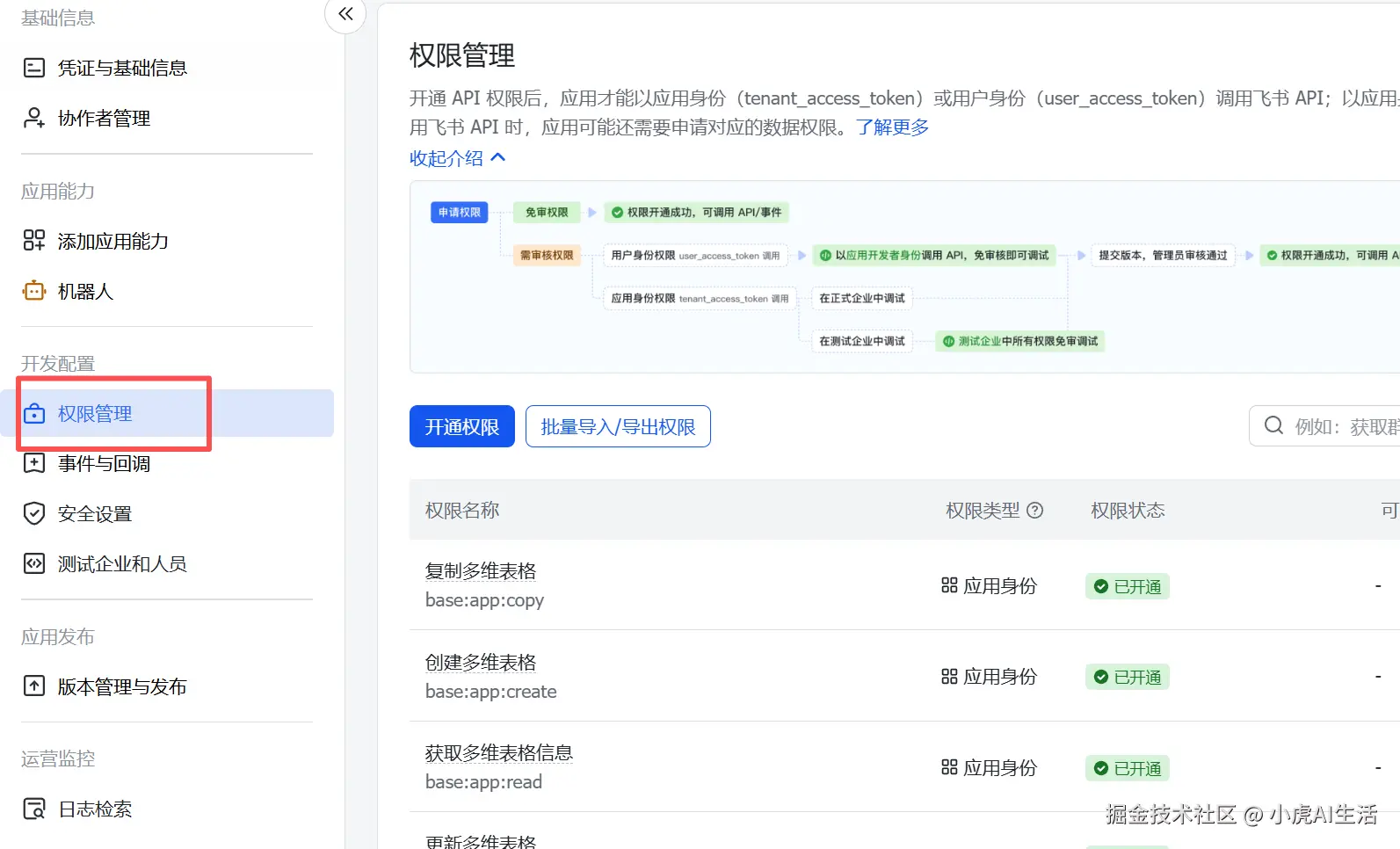 第二步:开通权限(必须做,否则机器人收不到消息)