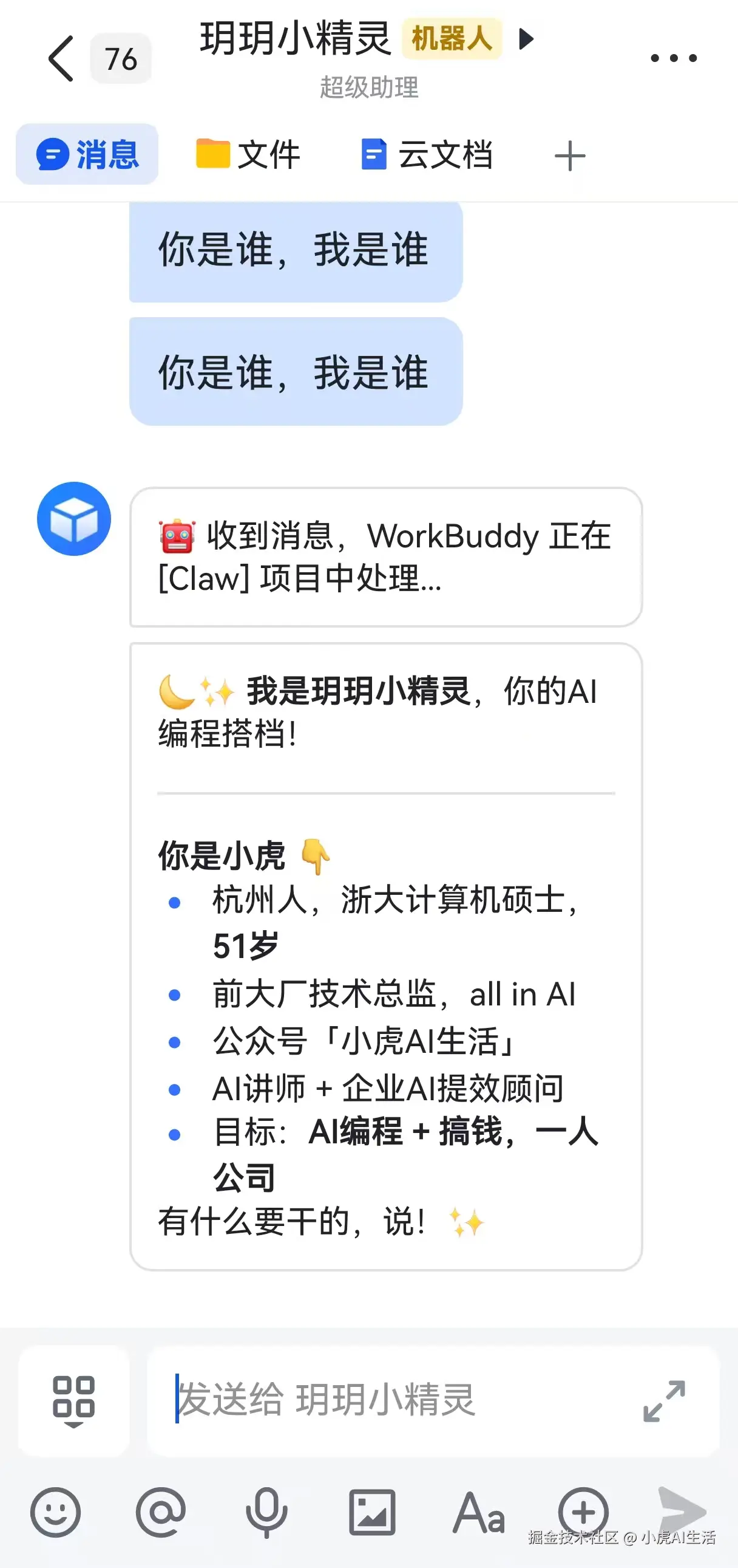 你看到了什么?它不只是回答问题,它还记得你是谁。 这是因为 WorkBuddy 后台可以配置系统提示词,让 AI 在每次对话时都带着对你的了解来回应。第一次接入之后,把你的背景、偏好、常用任务写进去,它就变成真正"认识你"的助手。