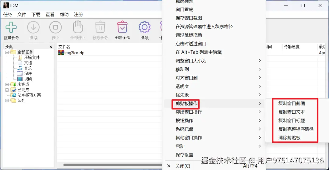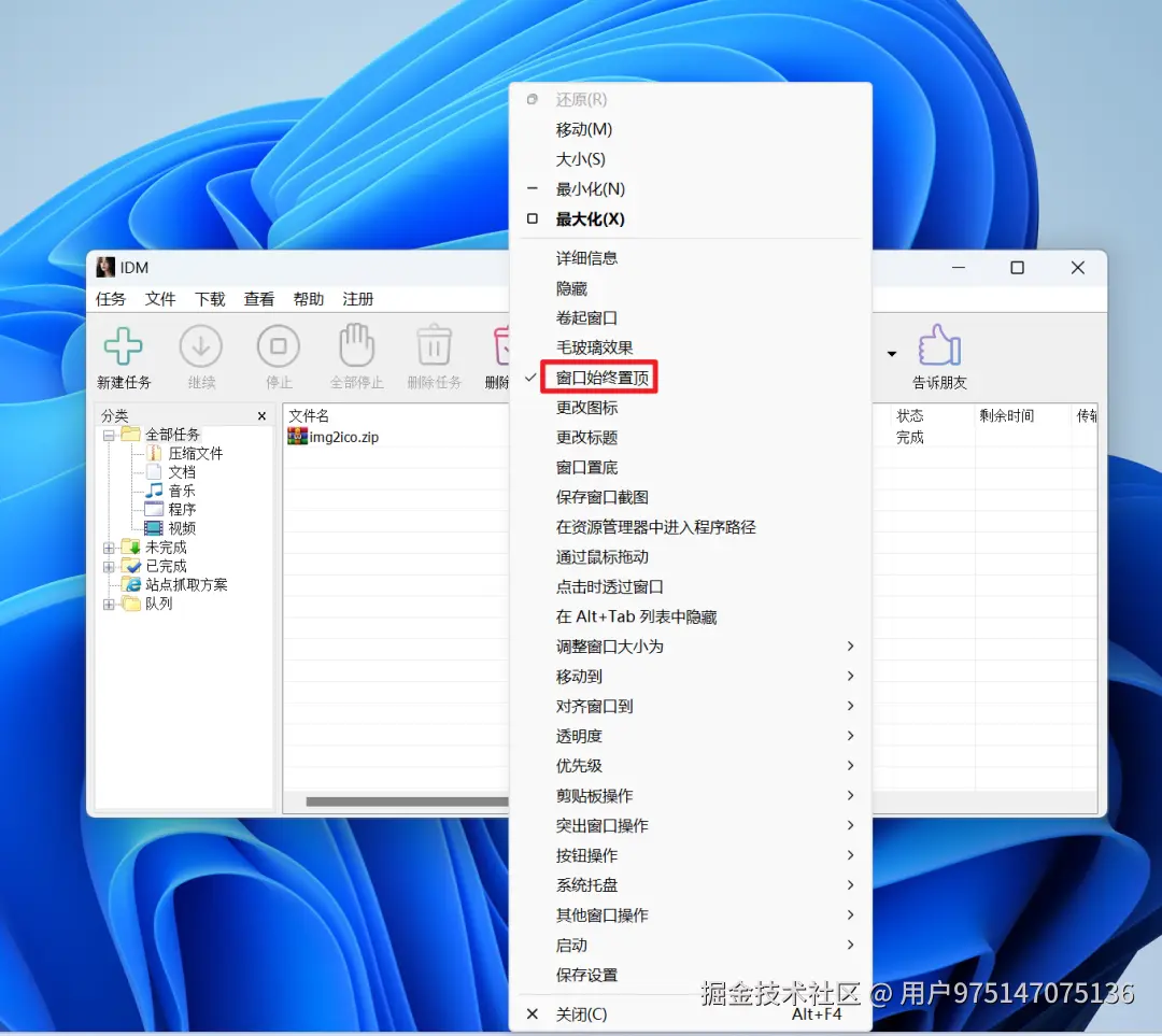 窗口置顶: 窗口置顶这个功能有时候还是蛮需要的,像微信就有置顶的功能,而如果没有置顶功能的软件,我们可以使用置顶的功能,比如IDM这款工具,我们可以选择“窗口始终置顶”的功能。