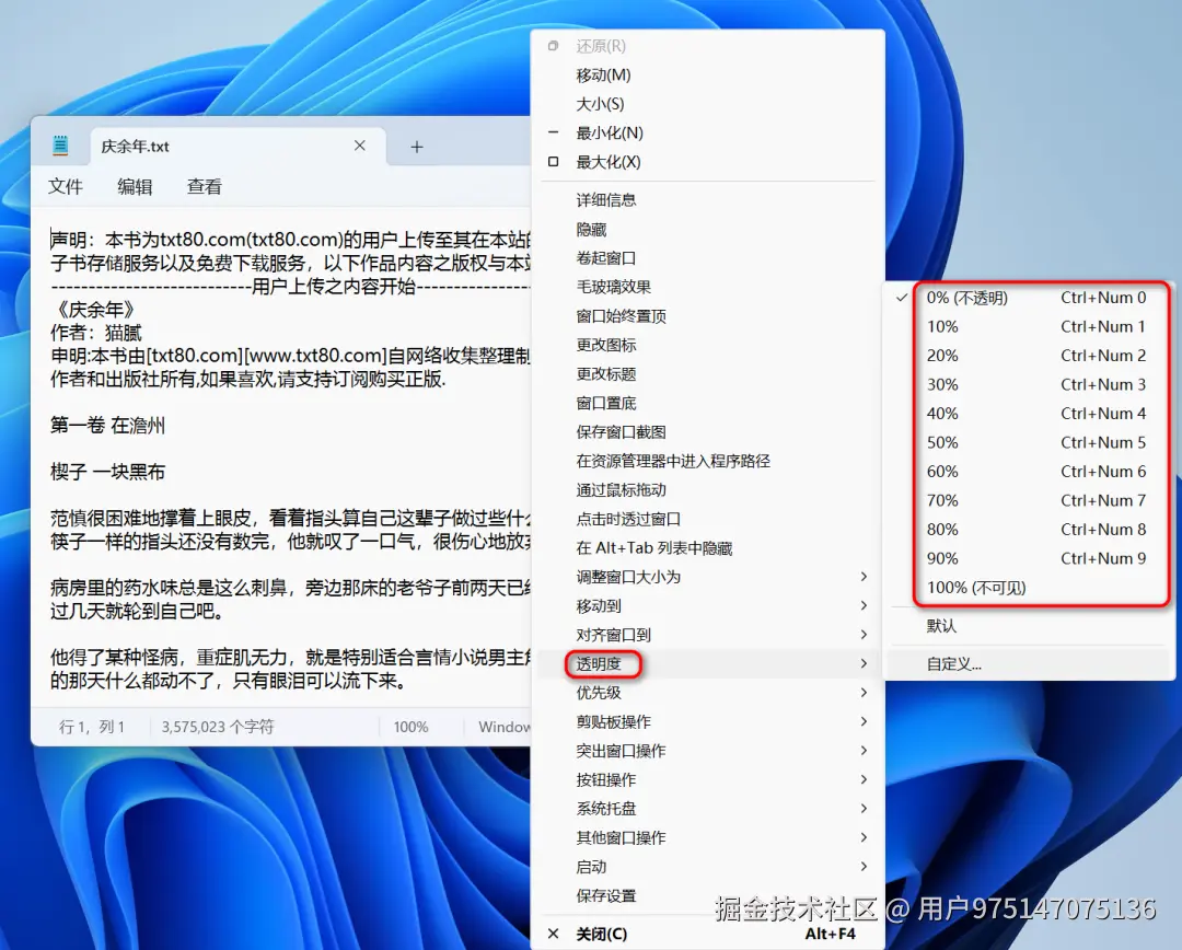 窗口透明度: 这个功能很适合打工人,偶尔摸个鱼什么的,可以调整窗口透明度,并且这个透明度可以用快捷方式来实现,“Ctrl+0”至“Ctrl+9”