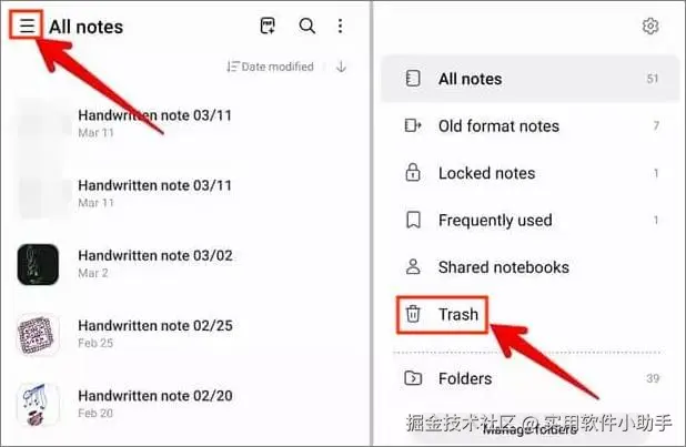 方法一:如何从回收站文件夹中找回三星笔记?大多数三星手机的备忘录应用中都有一个回收站文件夹。每次删除备忘录时,它们都会被移到回收站文件夹并保留一段时间,之后才会被永久删除。因此,在此期间,如果您不小心删除了备忘录文件,仍然可以尝试恢复。但时间过后,由于备忘录已被永久删除,将无法从回收站中恢复。