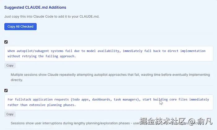 从这个角度看,Insights 报告就是帮助 CLAUDE.md 持续进化的工具,它给出的修改建议,对判断哪些内容已经成熟到值得正式记录特别有用。
