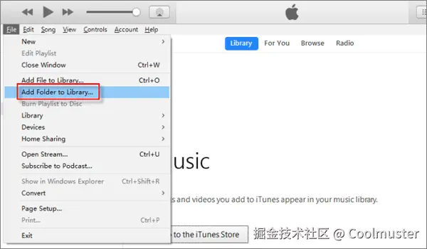 步骤2.将iPhone连接到电脑并启动iTunes。在iTunes上,请转到 “文件” > “将文件夹添加到库” >“将传输的文件添加到库”。