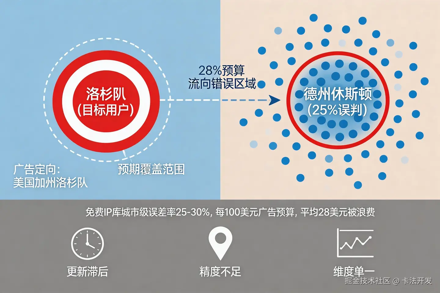 去年我接手一个面向美国加州的跨境投放项目,广告平台支持按城市定向。两周后数据出来:点击率1.5%,转化成本45美元。排查发现,免费IP库把大量德州用户误判为加州用户,广告展示严重偏离目标。换成专业方案后,点击率翻倍,成本降了四成。下面我把这套适用于跨境业务的方法拆开讲。