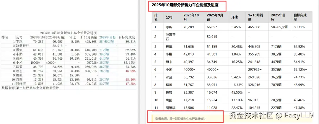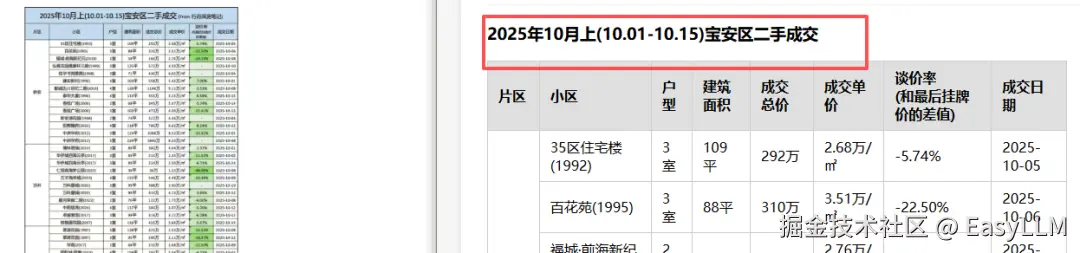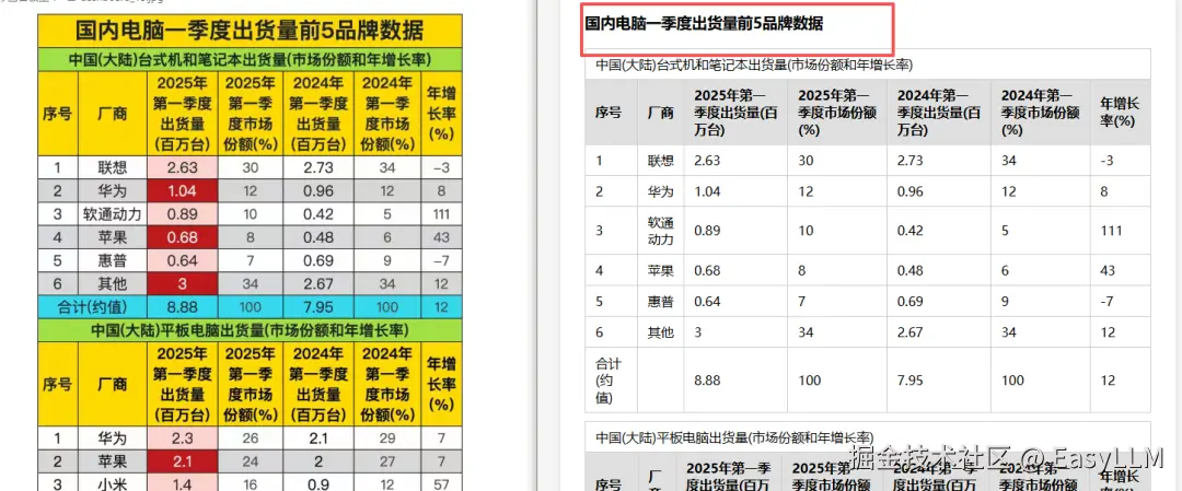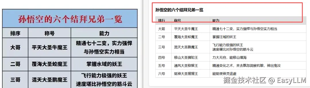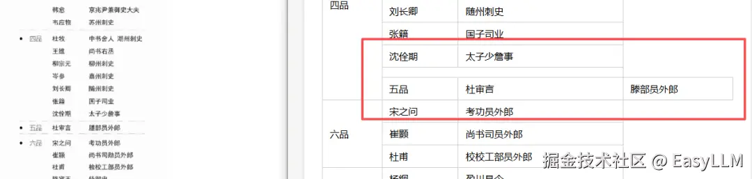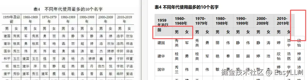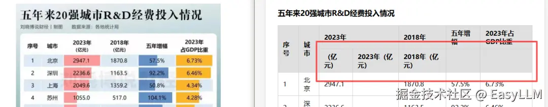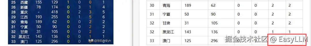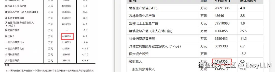 几乎涵盖了我们定义的所有错误类型:表头内容识别错误或直接缺失;相邻单元格内容合并导致数值串行;无法识别表格边界,凭空多出行列;水印区域不仅丢内容,还会把水印文字混入表格数据;标题经常被直接省略,只输出光秃秃的表格主体。