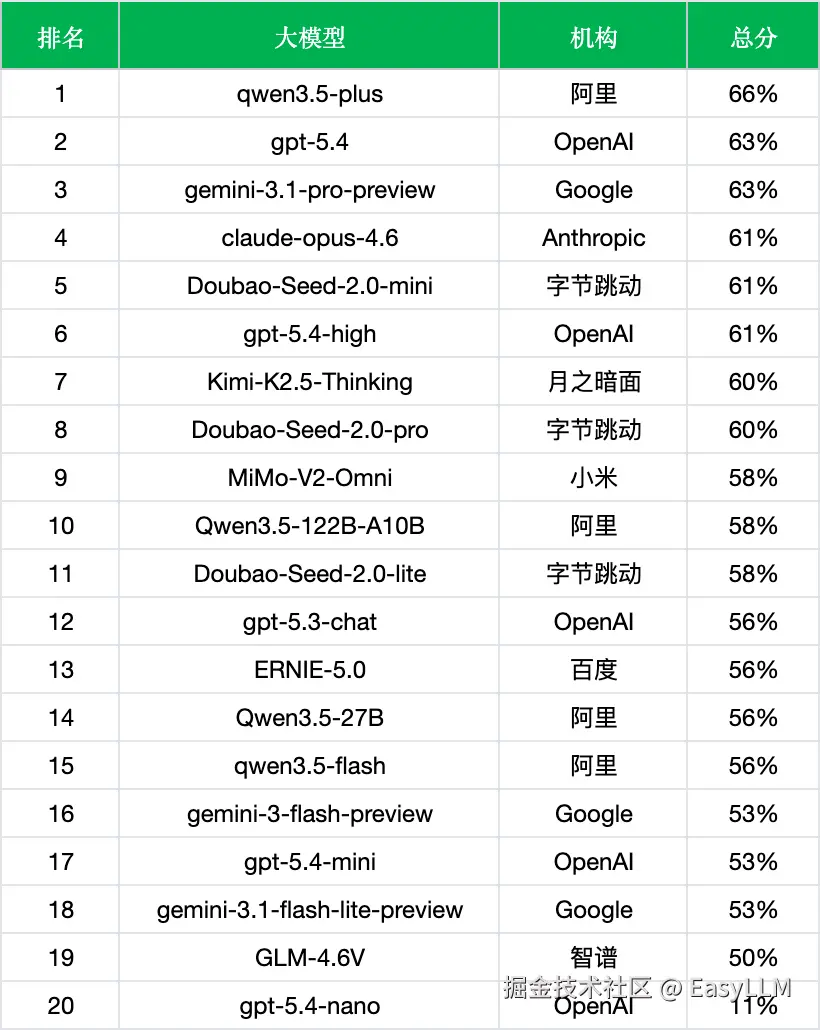首次参评即跻身中游,超过了 gpt-5.3-chat(56%)、ERNIE-5.0(56%)等选手,与 Qwen3.5-122B-A10B、Doubao-Seed-2.0-lite 同处 58% 梯队。对于一个以 Agent 感知为定位的全模态模型来说,算是合格的初登场。
