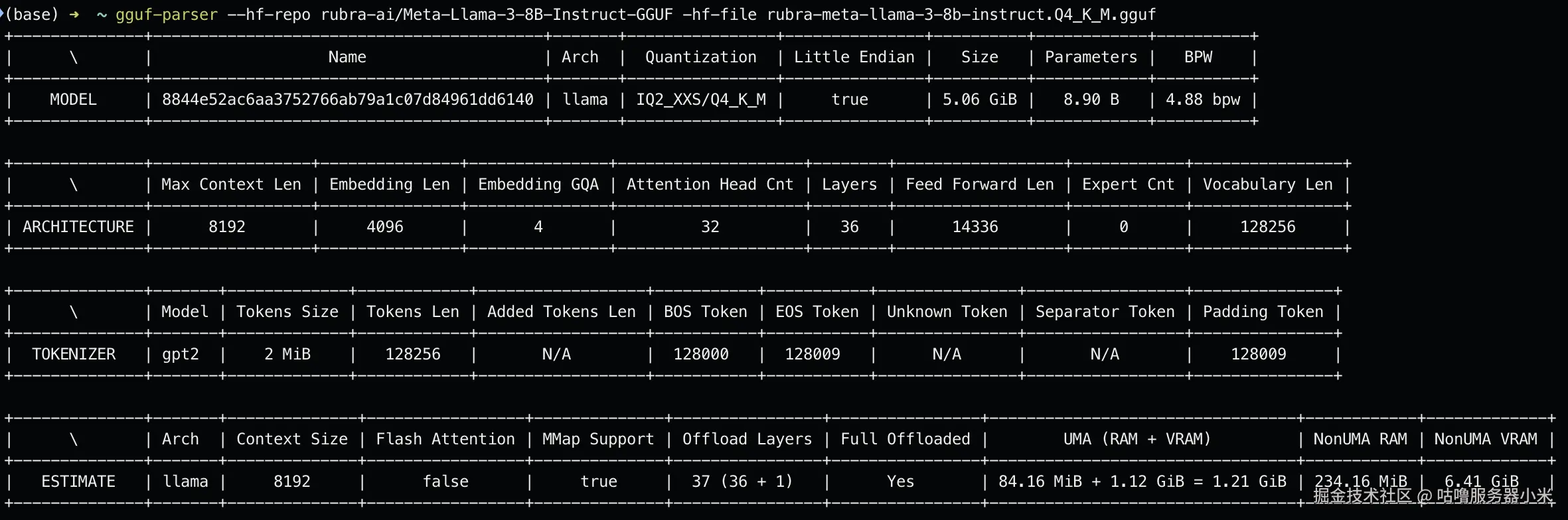 运行 GGUF Parser 并关注 ESTIMATE 部分的结果,这里指定了 rubra-ai/Meta-Llama-3-8B-Instruct-GGUF 库中的 rubra-meta-llama-3-8b-instruct.Q4_K_M.gguf 文件: