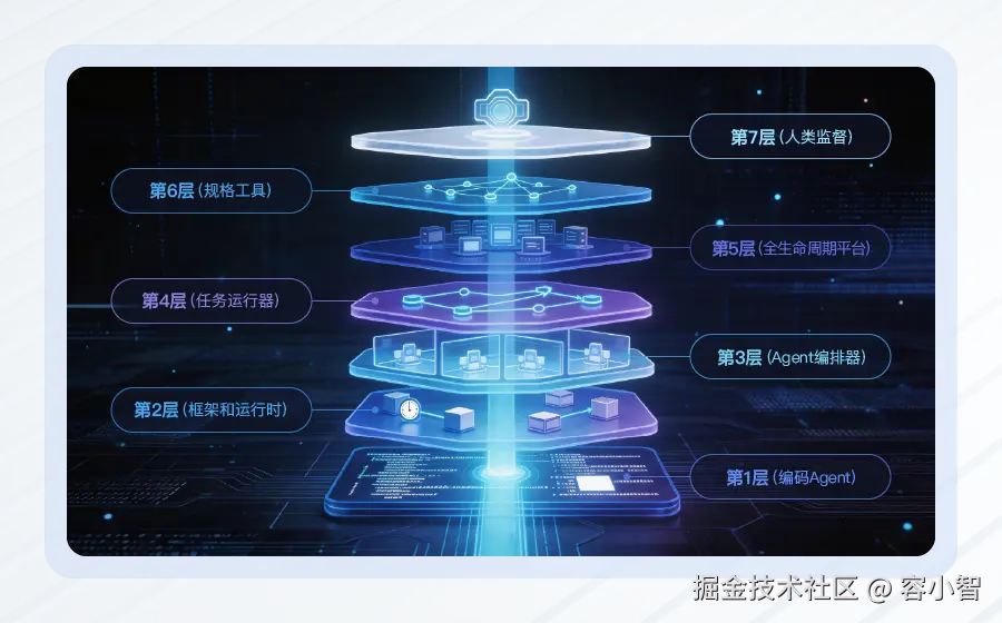 第7层(人类监督):工程师审批方案、Review PR、设定优先级,核心是设计环境,而非亲自写代码。