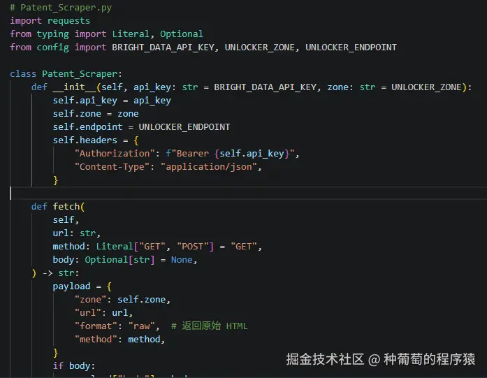这里面涉及到一个最重要的开发环节是封装Web Unlocker调用,去请求不同站点的网页数据,需要填写之前申请的unlock api key信息,并按照模板开发代码。