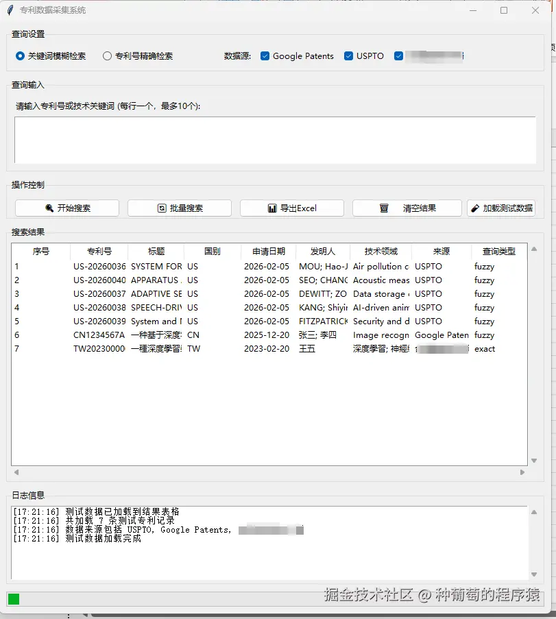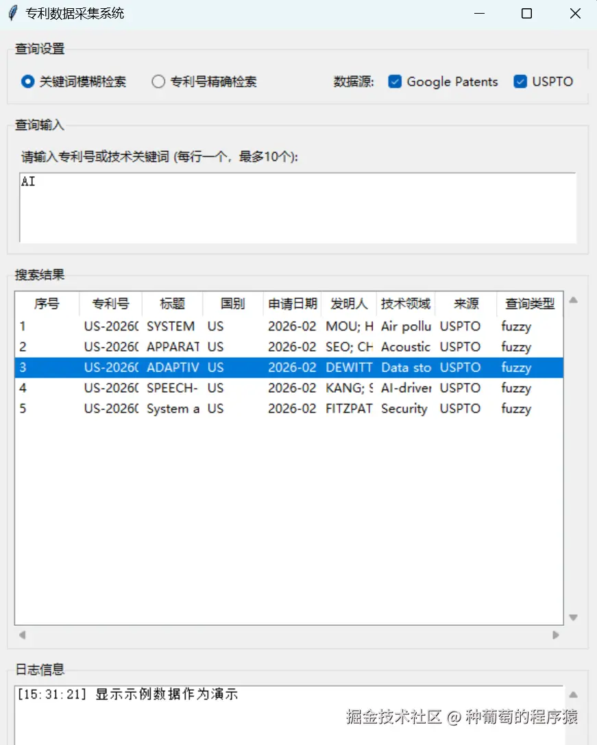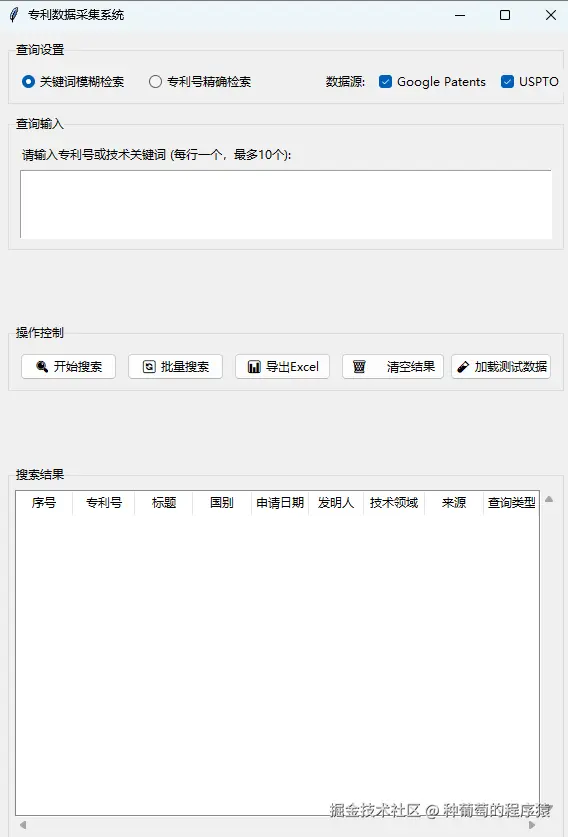 所以我打算用Python结合亮数据的网页解锁API去采集数据,并搭建一个可以交互的GUI系统,支持通过专利号或者关键词去检索不同网站的专利信息,并能直接展示和导出结果Excel。