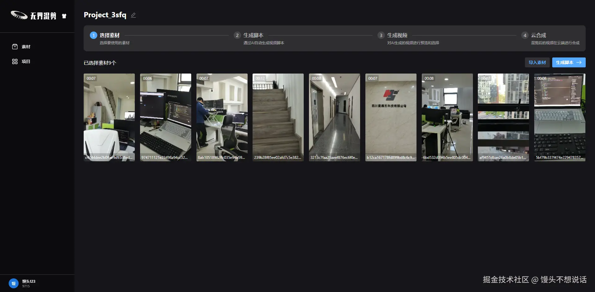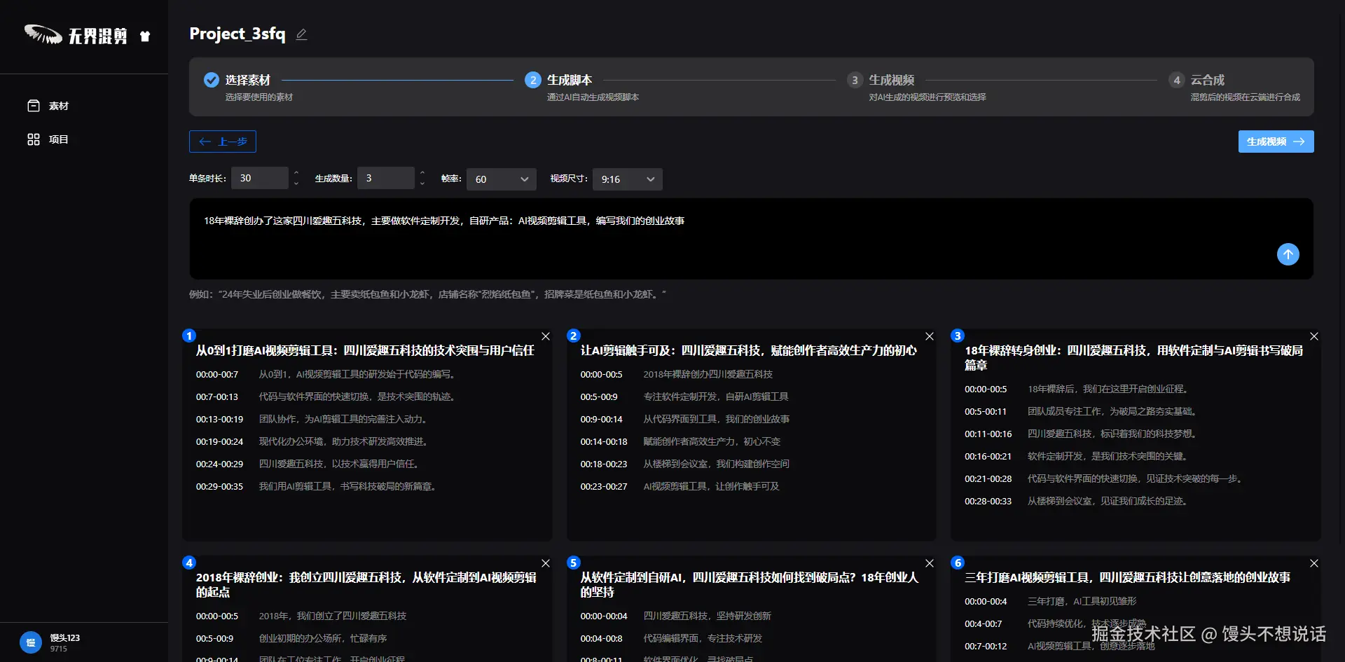 输入视频要求回车,AI会自动生成视频脚本,很厉害的是这个脚本不是胡乱生成的,是根据我们导入的素材内容生成的。