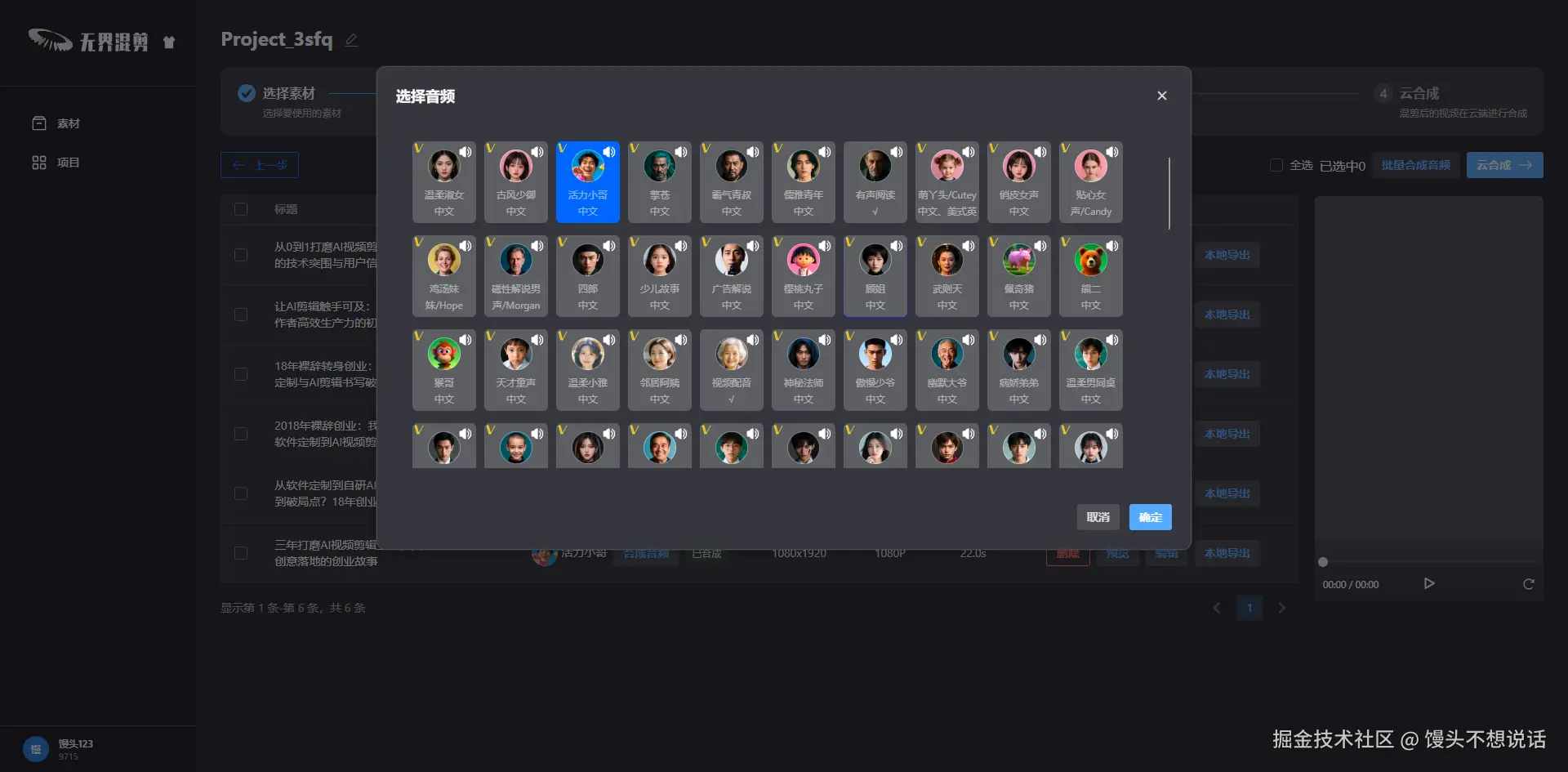 还可以自定义音频角色,点击合成音频按钮就可以生成配音了,这里有很多抖音很火的配音角色可选择。