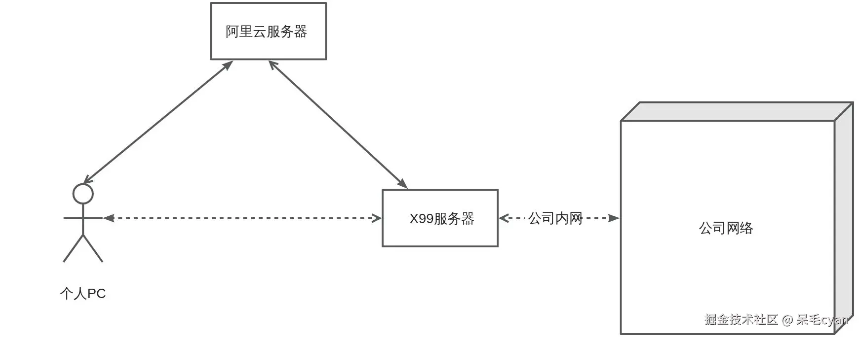 想要实现在家里也可以访问公司内网,我们需要使用到wireguard,我们的网络如下图